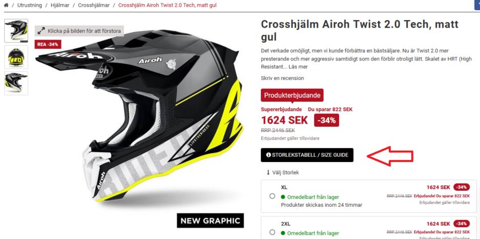 Storlekstabellen finns på produktsidan, från platsen som pekas ut av den röda pilen i bilden. Genom att klicka på den svarta knappen öppnas storlekstabellen i ett separat fönster.
