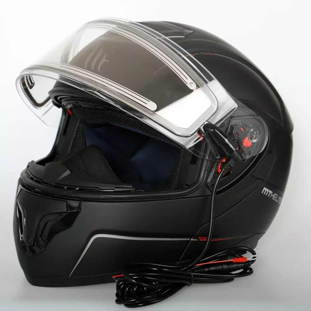 Motorcykelhjälmen MT Atom är en öppningsbar hjälm med elektriskt uppvärmt visir! Visiret immar inte i nästan någon situation alls. En utmärkt hjälm för vinterväder, hjälmen har färdigt en vintermask, som riktar bort utandningen från visiret och samtidigt skyddar kinderna när man åker med visiret öppet. Den avancerade vädringen som omfattar hela hjälmen fungerar oberoende av huvudets läge. För sommaren kan man köpa ett vanligt genomskinligt visir till hjälmen.