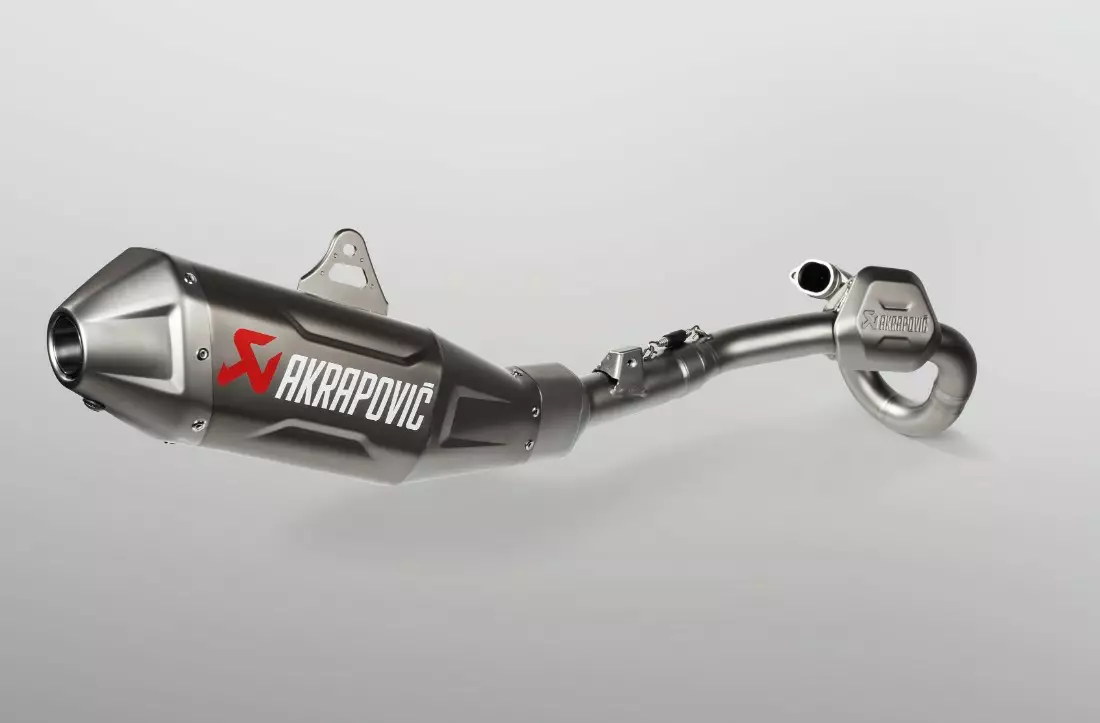 Constructed from lightweight, high-grade, premium titanium alloys, with different thickness in the sections to ensure perfect protection and to reduce overall weight, the system is 26.5% lighter than the stock exhaust. A new profiled surface influences the sound to meet the FIM noise limits for competition, and it adds strength and durability to the muffler while delivering a deep, full sound that embraces the balanced pulse of the single-cylinder engine.